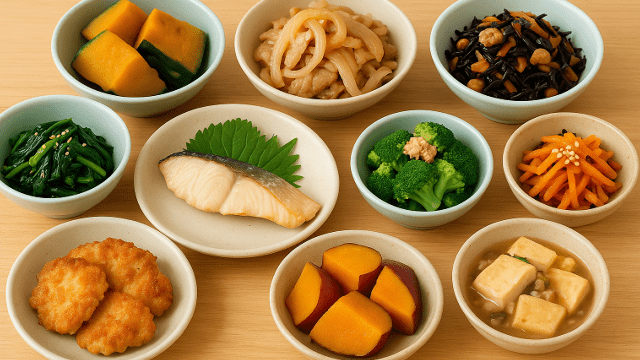 日曜日:白身魚の塩麹蒸し・ひじきと大豆の煮物・さつまいもの甘煮。消化にやさしく食べやすい料理で体を整えながら必要な栄養を取りやすい献立です。週の終わりに負担の少ない組み合わせで体調を整えます。