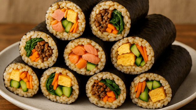 サーモンは刺身用を細長く切り大葉と合わせて清涼感を出します。肉入りでは鶏そぼろを甘さ控えめに煮含め粗熱を取り汁気を切ってから使います。焼肉風は薄切り牛肉を醤油とみりん少量でさっと炒め冷ましてから巻きます。子ども向けでは甘め卵焼きとチーズ少量ハム細切りを中心にして塩分は控えめにします。