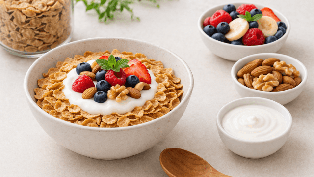 朝食として取り入れる場合は一食として成立させることがポイントです。例えば無糖ヨーグルトに玄米フレークをひとつかみ程度入れて、そこにナッツを小さじ1杯ほどとバナナやベリーなどの果物を加えると炭水化物・たんぱく質・脂質が自然に揃いやすくなります。
