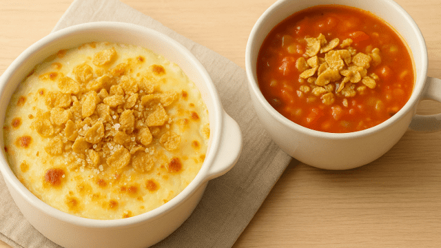 スープではミネストローネ・ポタージュ・コーンスープなどとろみのあるタイプによく合います。食べる直前に加えるとカリッとした食感が残り時間をおくとやわらかくなって別の味わいが楽しめます。グラタンではホワイトソースの上に玄米フレークを広げ粉チーズを少量振って焼くと表面がこんがりと香ばしくなります。パン粉よりも焦げ色がやさしく口当たりも軽く仕上がります。