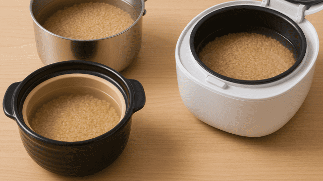 土鍋は鍋自体が水を吸いやすいのでやや多めにします。圧力鍋で炊く場合は気密性が高く蒸気の逃げが少ないため水はやや少なめでよいです。炊飯器の場合は自動調整機能が働くため標準の玄米ラインに合わせると失敗しにくくなります。普通の鍋は蒸気が逃げやすいですが基本の1.5倍かやや多めにすると均一に炊き上がります。