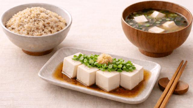 玄米と豆腐を中心にしながら味噌・海藻・納豆・野菜などを少しずつ組み合わせていくことで日本の食文化に近い落ち着いた食事の形が生まれます。こうした食べ合わせは特別な料理としてではなく日常の食卓に取り入れやすい組み合わせでもあります。