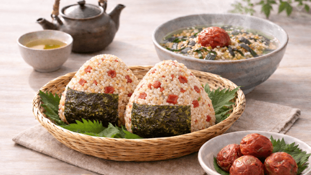 玄米はゆっくりとエネルギーに変わる主食であり、そこに梅干しの酸味が加わることで味覚的なメリハリが生まれます。