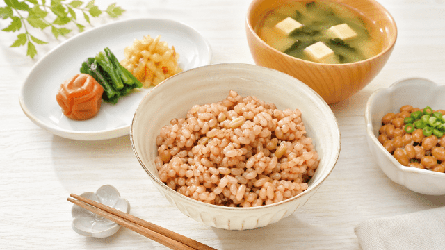 まずはシンプルな食べ方で素材そのものの美味しさを確認できます。梅干(白干し)や味噌汁そして納豆といった基本的な和食の組み合わせは玄米の香ばしさと相性がよく毎日の食事として取り入れやすい構成です。