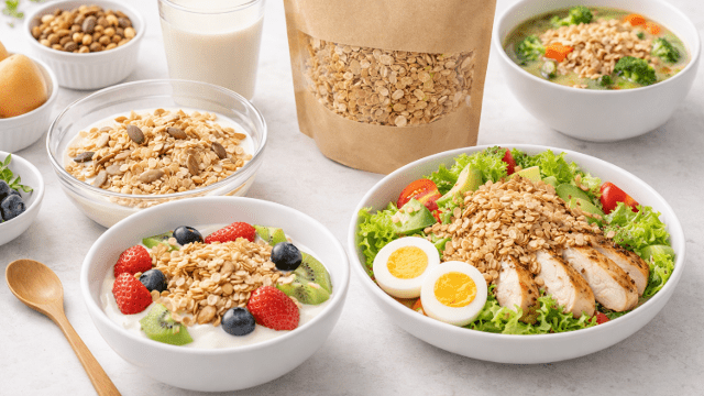まず基本となるのはタンパク質を含む食品との組み合わせです。ヨーグルトや豆乳ほか牛乳などを加えることで穀物中心になりやすい食事に不足しやすい栄養素を補いやすくなります。特にヨーグルトと組み合わせる場合は、なめらかな質感が加わることで食べやすさが変わり結果として満足感にも影響しやすくなります。